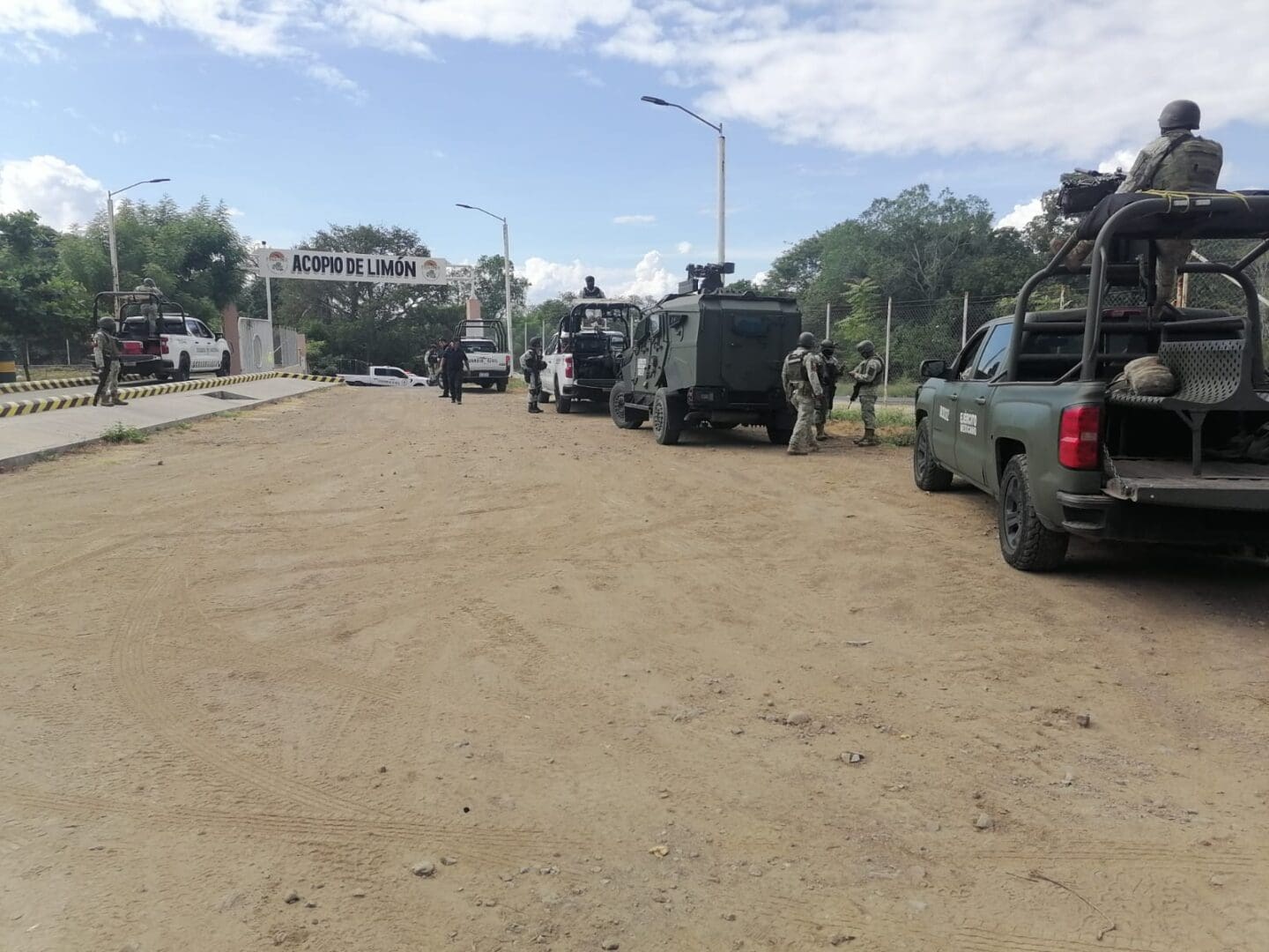 Apatzingán, Michoacán, 19 de noviembre de 2024.- Agentes de las secretarías de Seguridad Pública (SSP) y de la Defensa Nacional (Defensa), así como de la Guardia Nacional (GN), incrementaron la operatividad en los empaques limoneros en esta demarcación derivado del intento de incendio de unas tarimas al interior de uno de estos establecimientos.