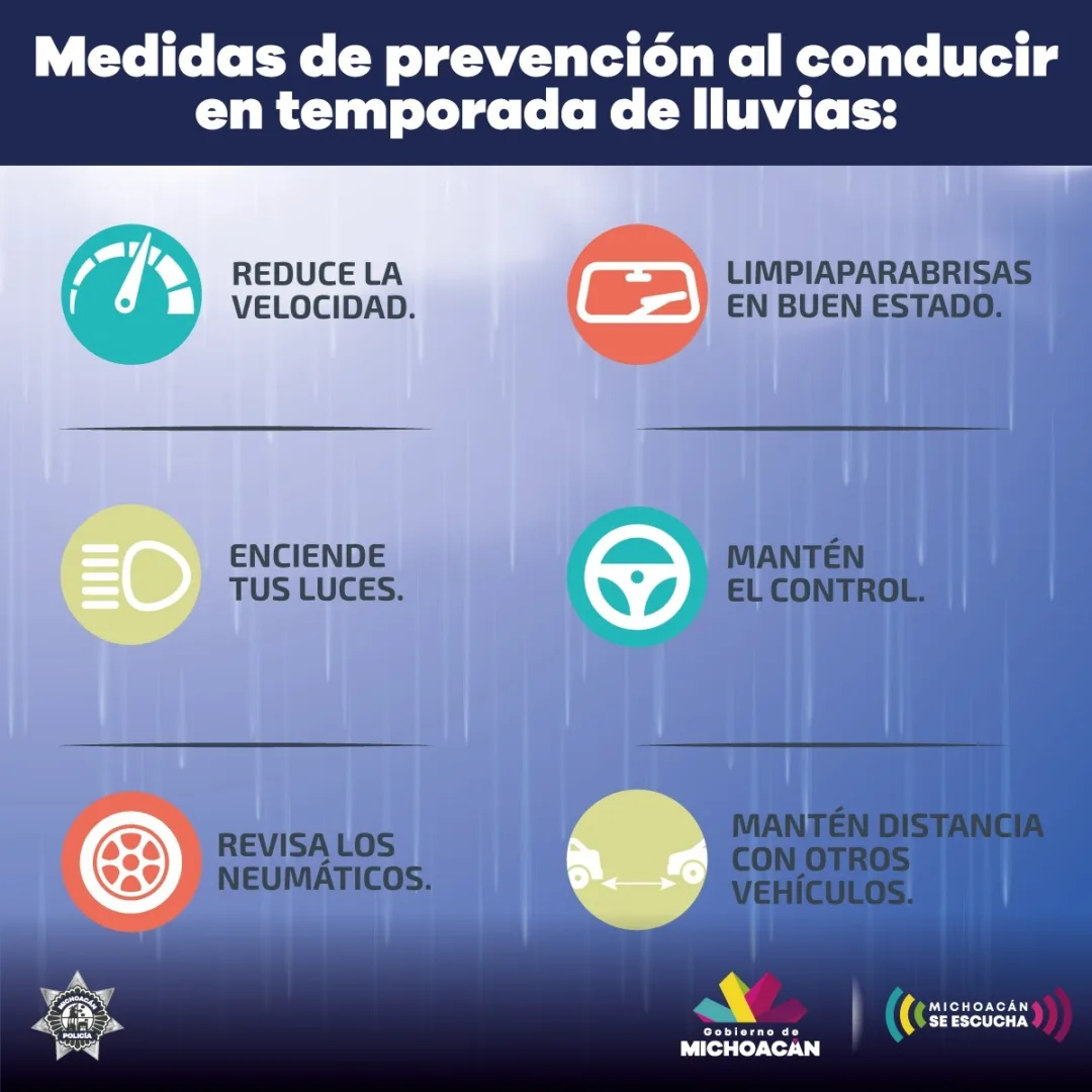 Morelia, Michoacán. – Para salvaguardar la integridad física de conductores y pasajeros, la Secretaría de Seguridad Pública (SSP), brinda una serie de recomendaciones preventivas, con la finalidad de evitar accidentes vehiculares durante esta temporada de lluvias.