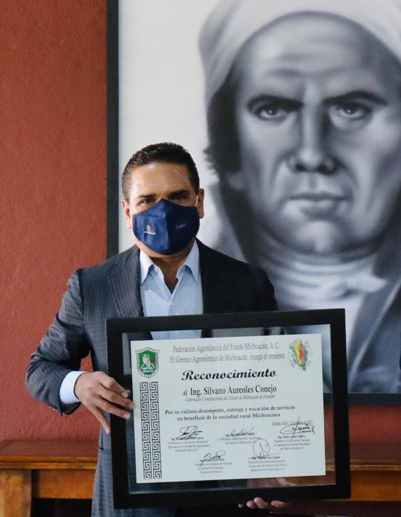 Al hacer entrega del reconocimiento al Gobernador, el presidente de la Federación Agronómica del Estado de Michoacán, José Martínez Cubillo, agradeció el respaldo y acompañamiento de la actual administración a los más