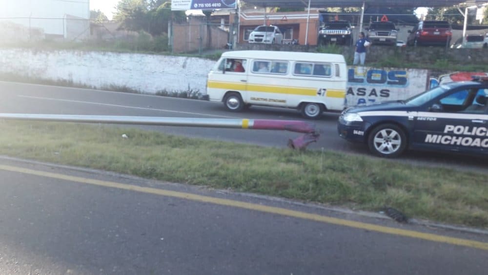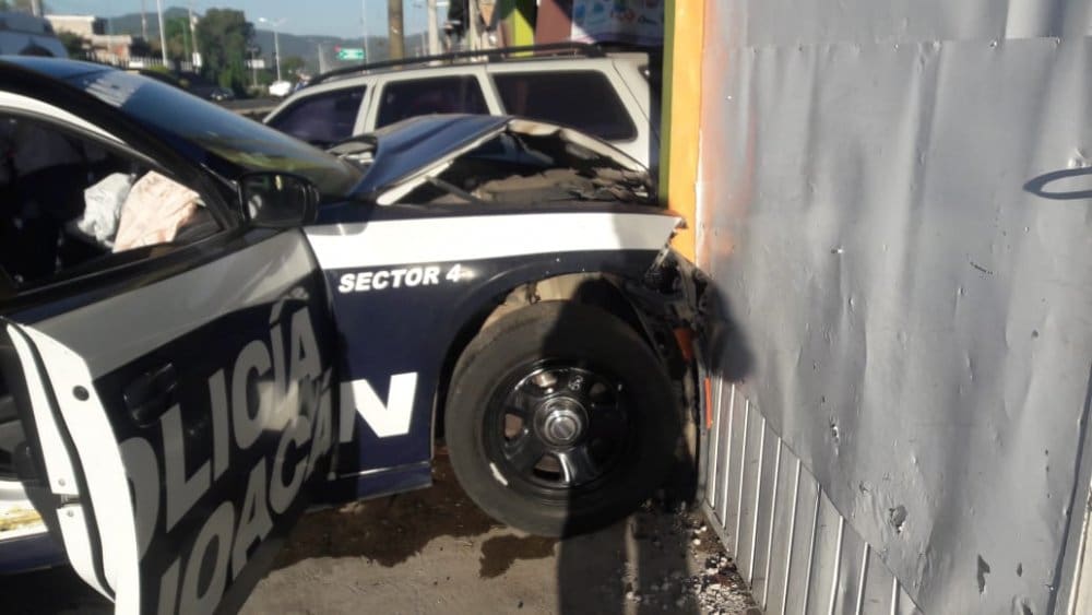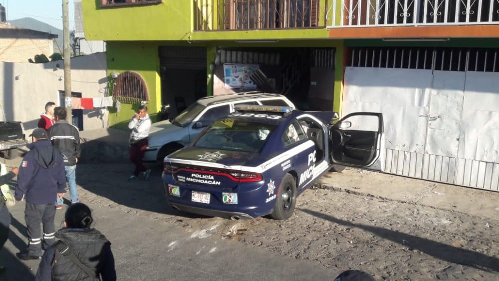 Se trata de un vehículo Dodge Tipo Charger, de la Policía Michoacán, el cual se impactó contra el portón de un domicilio a un costado de la tienda de autoservicio Los sauces, resultando dañado un automóvil que se encontraba estacionado afuera del domicilio, así como una lampara de alumbrado público.