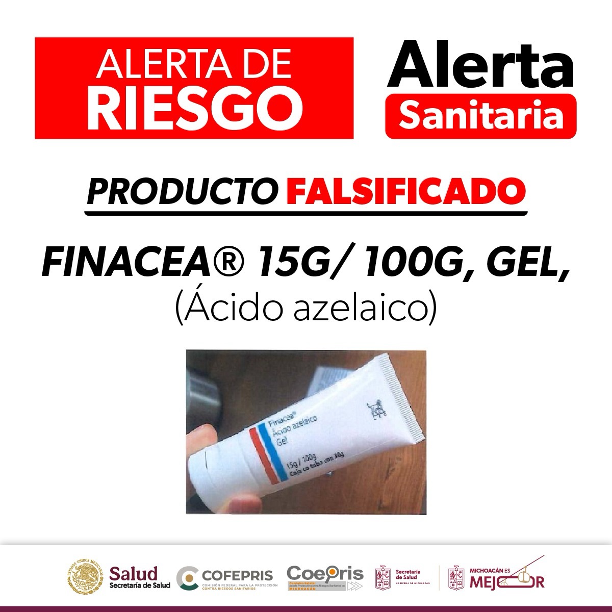 La Comisión Federal para la Protección contra Riesgos Sanitarios (Cofepris), en coordinación con la Secretaría de Salud de Michoacán (SSM), emitió una alerta sanitaria tras identificar la falsificación del medicamento Finacea (Ácido azelaico) 15 g / 100 g gel, indicado para tratamientos dermatológicos.