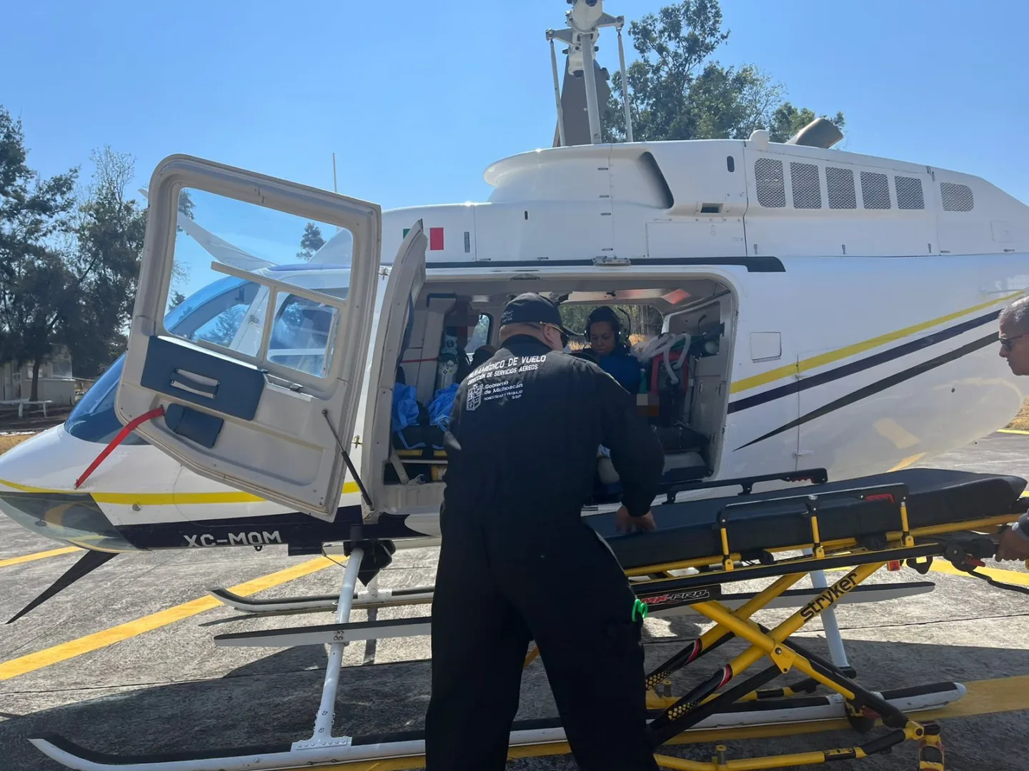 Los paramédicos de vuelo se trasladaron a un hospital ubicado en Carácuaro, donde se encontraba una paciente de 23 años de edad con complicaciones de embarazo, luego de sufrir puerperio patológico inmediato, eversión uterina con hemorragia obstétrica y útero revertido.