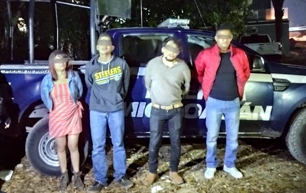 H. Zitácuaro, Mich., 28 de noviembre de 2021.- En atención a un reporte ciudadano Elementos de Seguridad Pública, llevan a cabo la detención de cuatro sujetos entre ellos una mujer, por el delito de daños en propiedad ajena sobre la calle Andrés Landa y Piña en el exterior del Bar Alebrije.