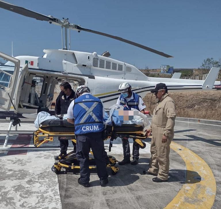 Los paramédicos de vuelo realizaron el traslado mediante la ambulancia aérea a un hospital mejor equipado ubicado en la capital del estado, donde ya recibe atención médica especializada.