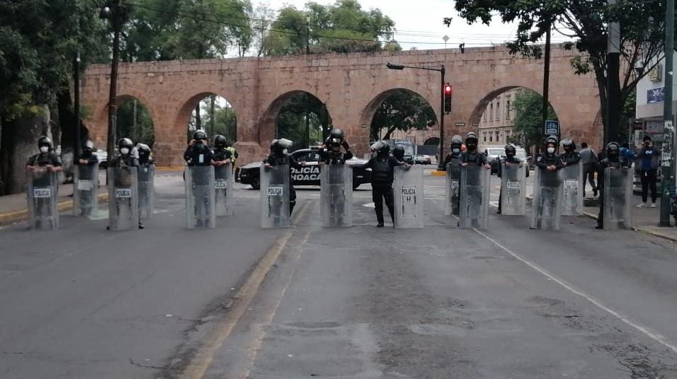 Morelia, Michoacán.- Con la finalidad de preservar el orden público, la Secretaría de Seguridad Pública (SSP), desplegó un dispositivo de movilidad y vigilancia en las inmediaciones de la Secretaría de Finanzas y Administración (SFA), ante una manifestación que realiza un grupo de personas.