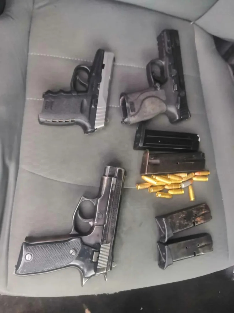 Tras darle alcance y llevar a cabo una inspección, a los ahora detenidos se les localizaron 3 armas de fuego de distintos calibres, así como cargadores y cartuchos útiles.