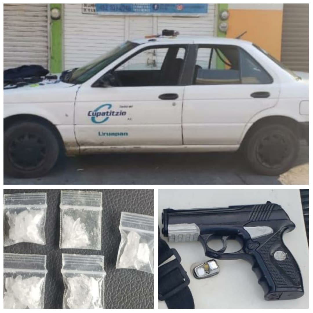 Patrullajes para prevenir el delito sobre la avenida Juan N. López a la altura de la colonia La Magdalena, permitieron al personal de la Policía Michoacán asegurar a Gerardo B., y Elias P., mismos que tripulaban una unidad de la marca Nissan -del servicio público-, localizándoles la citada droga y una réplica de un arma de fuego.