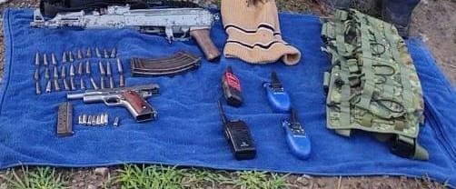 Al realizarle una inspección a Juan C., le fue localizada entre sus pertenencias dos armas de fuego calibres 7.62×39 mm., y .38 mm., dos cargadores, 38 cartuchos útiles, radios de comunicación y equipo táctico.