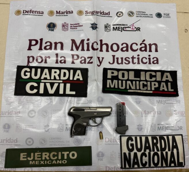 En una acción por separado en el municipio de Jacona, agentes de seguridad detuvieron a dos hombres tras una persecución en un tramo carretero. Según el reporte de las autoridades, los implicados viajaban en una camioneta GMC que contaba con reporte de robo con violencia. Durante la revisión del vehículo, los efectivos informaron el hallazgo de un arma de fuego corta.