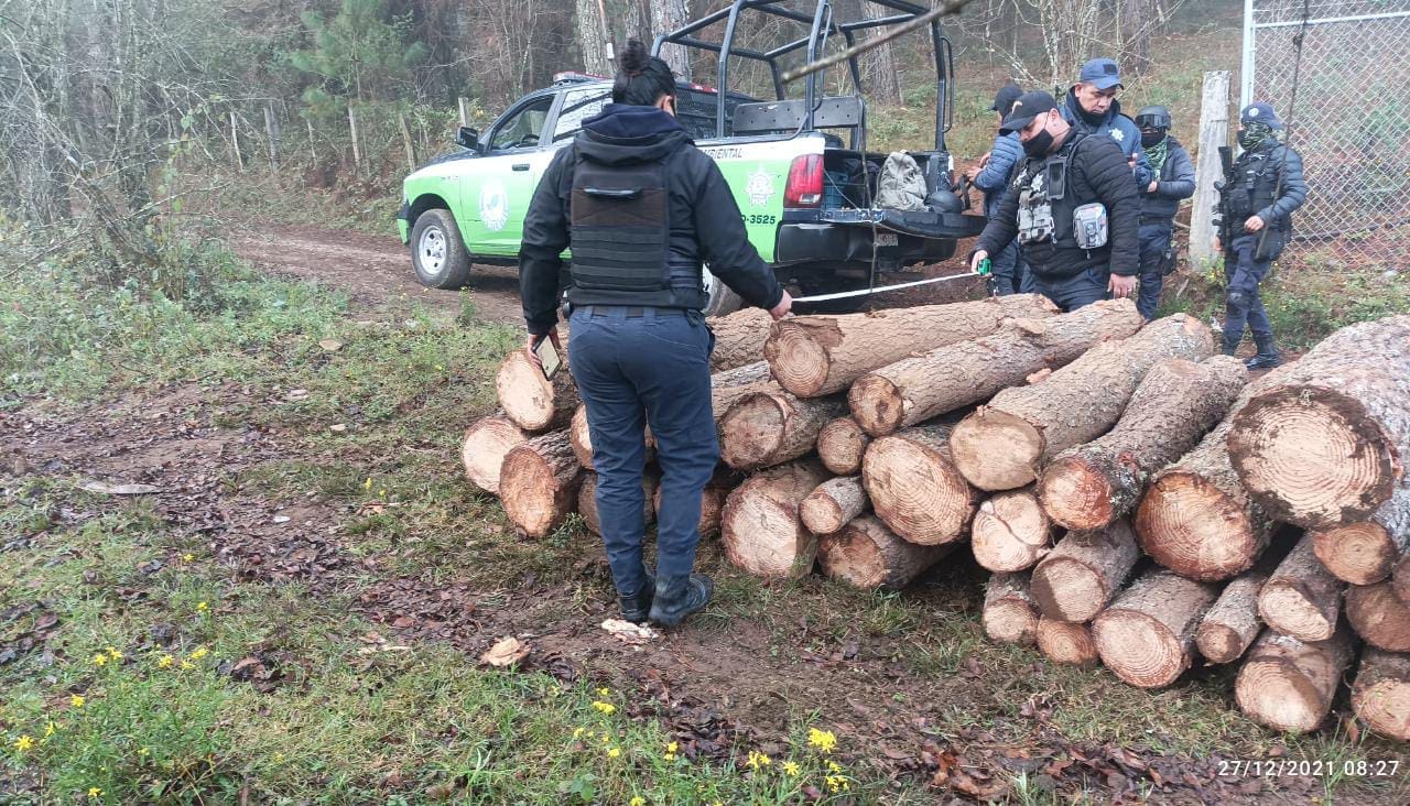 Morelia, Michoacán, 27 de diciembre del 2021.- Como resultado de los patrullajes y las labores que se realizan en las zonas boscosas este municipio, el personal de la División Ambiental de la Secretaría de Seguridad Pública (SSP) aseguró 47 rollos de madera, presuntamente ilícitos; hecho registrado en la localidad de Loma Caliente.