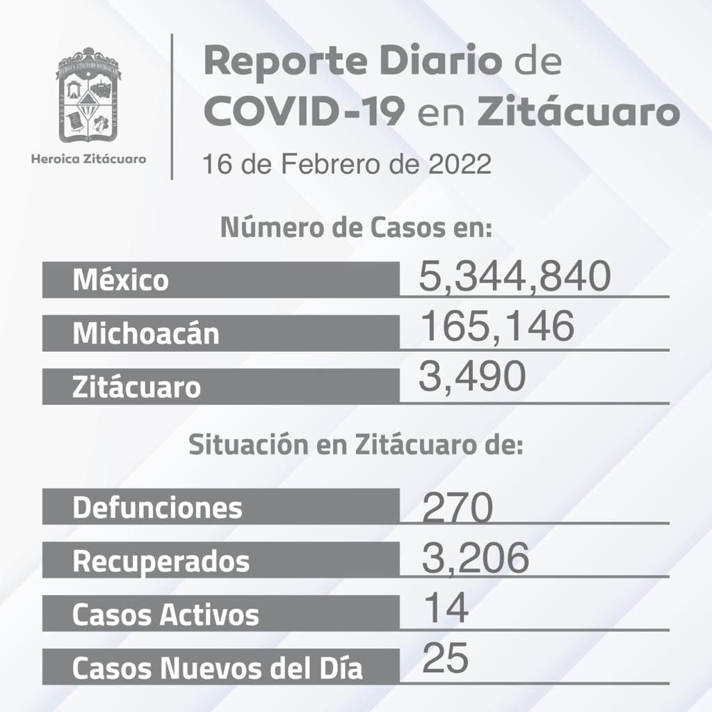 El Municipio de Zitácuaro presenta 25 casos nuevos, con corte al 16 de Febrero de 2022: