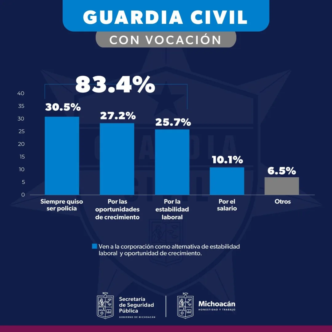 Una encuesta realizada por el Gobierno de Michoacán reveló que el 83.4 por ciento de los agentes es parte de la Guardia Civil por vocación, y es que el 30.5 por ciento respondió que siempre quiso ser policía, compromiso que refleja al salvaguardar la seguridad de las y los michoacanos.