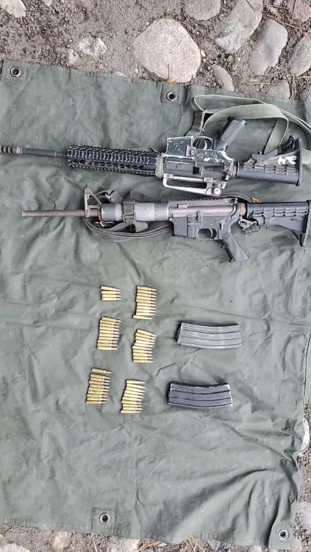Derivado de estos hechos, fueron localizados dos fusiles calibre .223 mm., dos cargadores y 54 cartuchos útiles, los cuales serán puestos a disposición de la autoridad competente, a efecto de llevar a cabo las actuaciones establecidas.