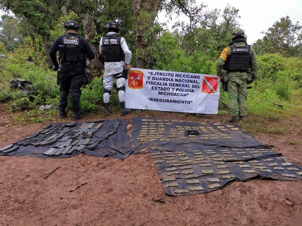 Tangamandapio, Michoacán, a 14 de julio de 2021.-Resultado del fortalecimiento de los esquemas operativos en este municipio, personal de las secretarías de Seguridad Pública (SSP), de la Defensa Nacional (SEDENA), y de la Guardia Nacional (GN), en un tercer hecho ocurrido en este municipio, se aseguraron a 2 menores de edad, 11 fusiles, 1430 cartuchos útiles y 57 cargadores.