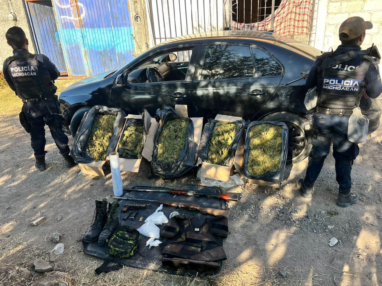 Morelia, Michoacán, 16 de diciembre del 2021.- Como resultado del reforzamiento de las tareas operativas para disuadir hechos ilícitos, los elementos de la Secretaría de Seguridad Pública (SSP) efectuaron el aseguramiento de cinco cajas con marihuana, tres bolsas con metanfetamina, tres armas de fuego, dos vehículos y diversas prendas de equipo táctico.
