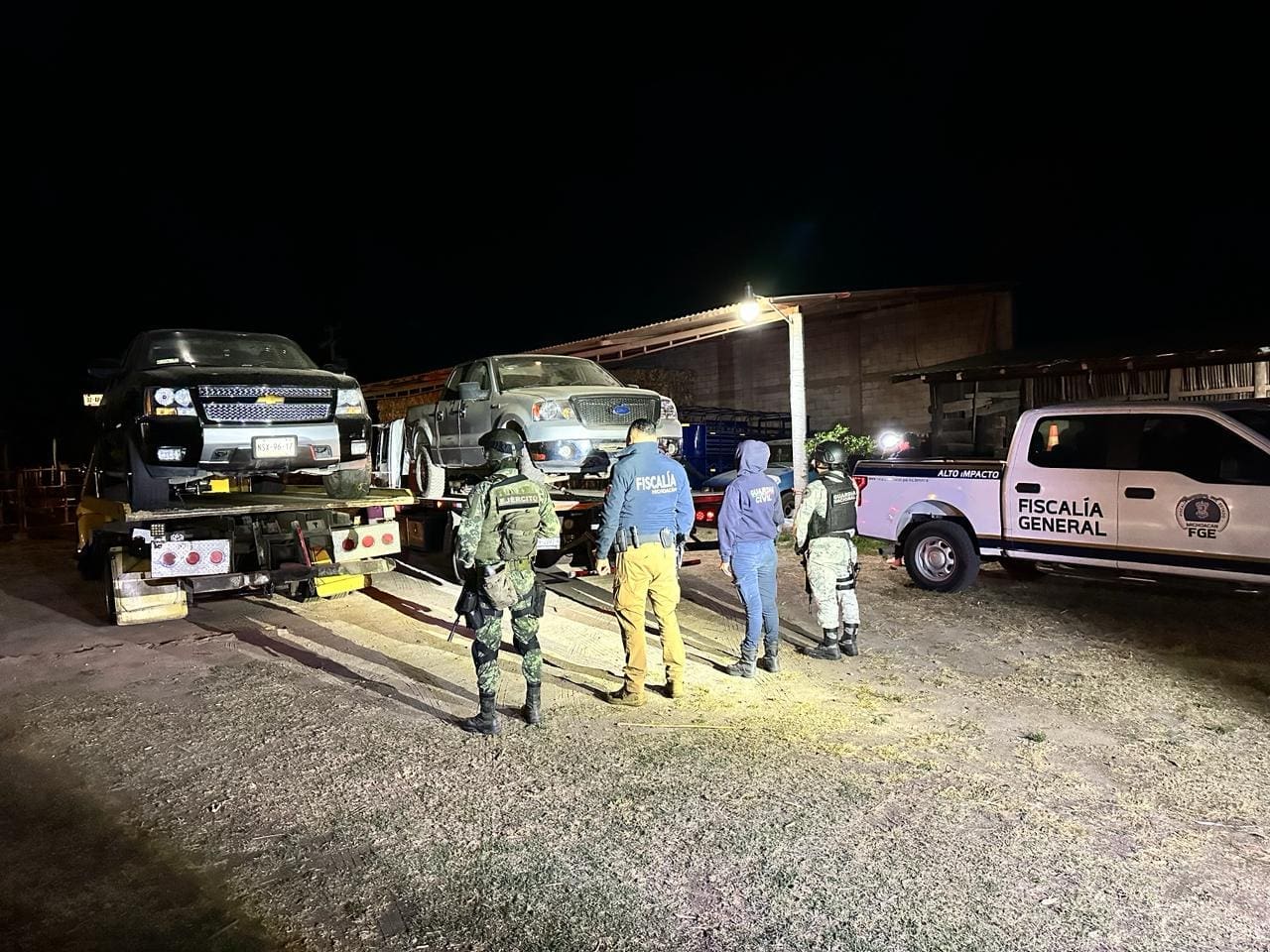 En atención a dicho mandato, personal de la Unidad Contra el Robo al Transporte de la Fiscalía Especializada para la Atención a Delitos de Alto Impacto, con apoyo en aseguramiento perimetral de elementos de la Guardia Nacional (GN), Guardia Civil (GC) y de la Secretaría de la Defensa Nacional (SEDENA), se trasladaron al sitio en el que ubicaron dos camionetas, una de la marca Chevrolet, y otra de la marca Ford, las cuales contaban con reporte de robo del 24 de junio del 2023, cometidos en este mismo municipio.