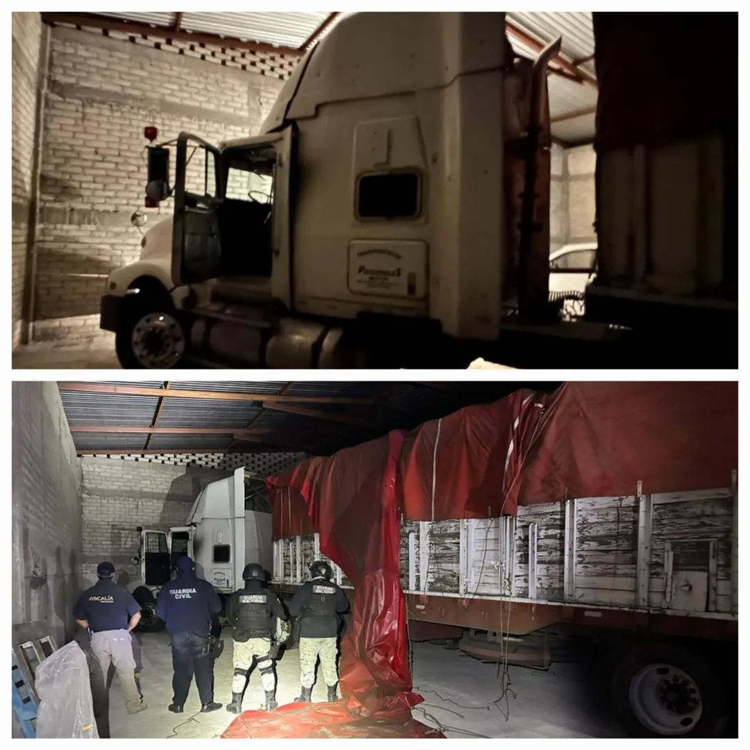Personal de la Unidad Contra el Robo al Transporte, adscritos a la Fiscalía Especializada para la Atención a Delitos de Alto Impacto, con el apoyo de la Guardia Nacional (GN) y de la Guardia Civil (GC) que brindó seguridad perimetral, realizó diligencias en esta propiedad, donde recuperó un tractocamión, marca dina, color blanco y un remolque tipo jaula de color blanco.