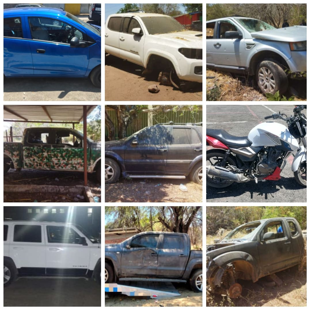 Los elementos de la Policía Michoacán realizaron patrullajes de inspección y vigilancia en los municipios de Apatzingán Hidalgo, Jacona y Morelia, donde aseguraron los siguientes vehículos: siete camionetas de las marcas Jeep, Mercedes, Toyota, Volskwagen, Ford, Land Rover y Nissan, las cuales se encontraban en estado de desvalijamiento y tres de ellas con reporte de robo vigente, así como un automóvil Chevrolet y una motocicleta marca Carabela.