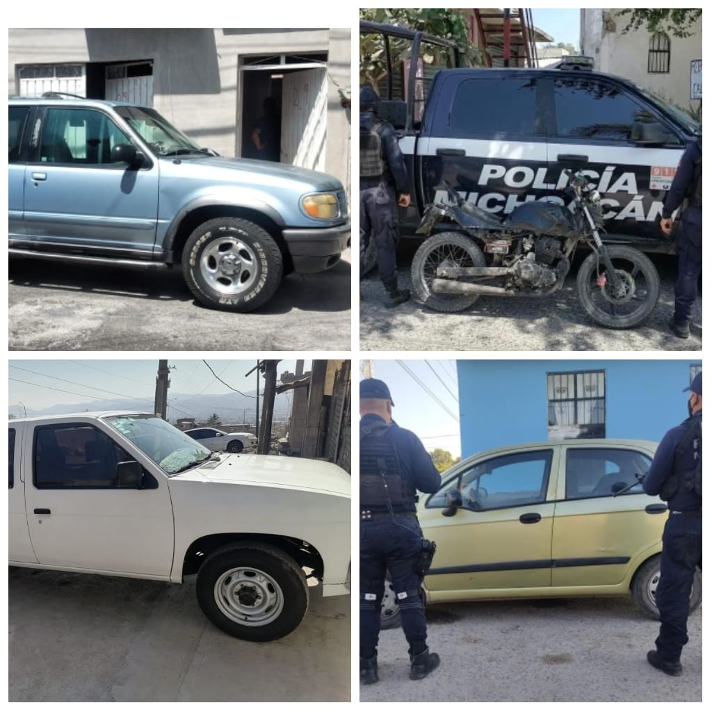 Las acciones de patrullaje y disuasión del delito realizadas en los municipios de Lázaro Cárdenas y Morelia, permitieron recuperar los siguientes vehículos: un automóvil de la marca Pontiac, una camioneta Ford, una Nissan, así como motocicleta Italika.