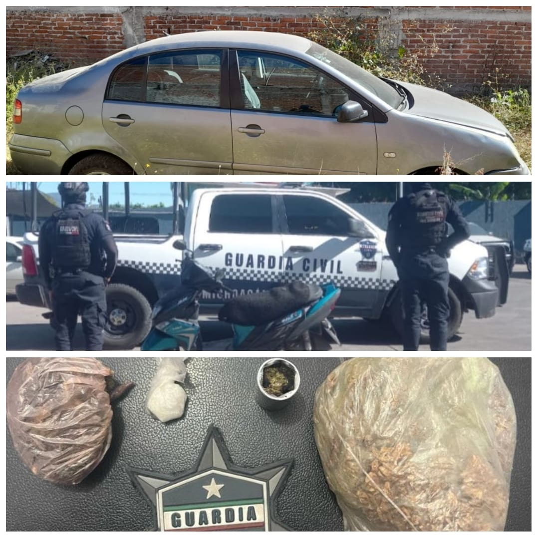 En Jacona, Uruapan e Hidalgo, GC asegura tres vehículos y detiene a dos personas en posesión de drogas