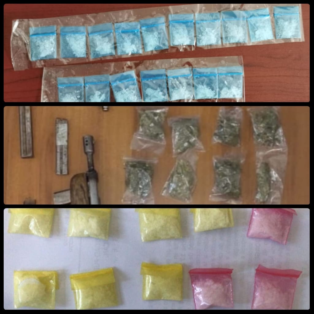 *A los indiciados les fueron detectados envoltorios con metanfetamina, marihuana y dos armas hechizas, respectivamente.