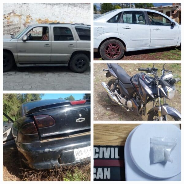 Entre los vehículos recuperados, destacan cuatro de la marca Chevrolet, un Ford, una Jeep, un Mazda y una motocicleta Yamaha; todos con reporte de robo. Las detenciones incluyeron a siete hombres y una mujer.