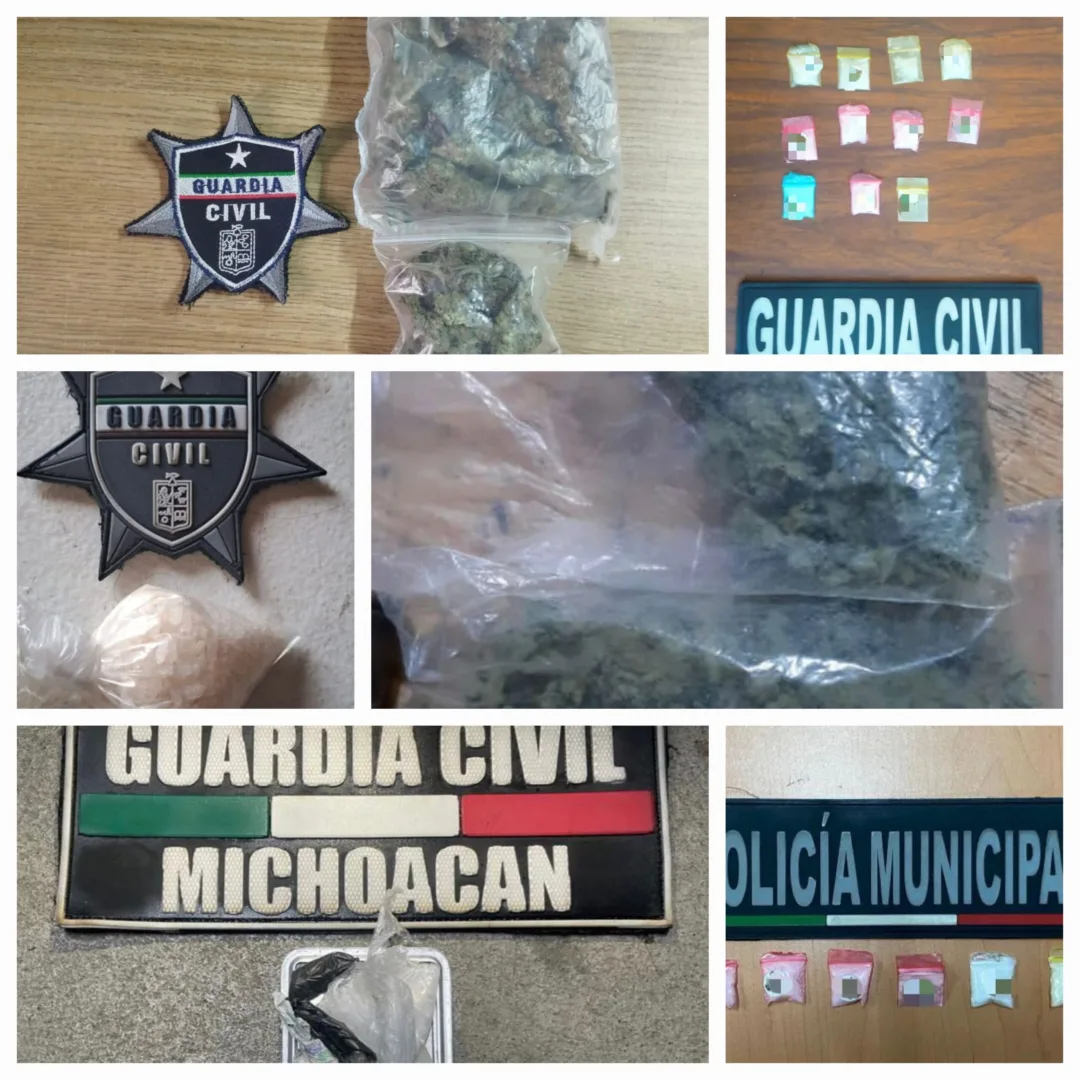 En la ciudad de Morelia, los guardias civiles aseguraron a ocho hombres y una fémina por portación de sustancias ilícitas; en total, decomisaron 15 dosis de metanfetamina y cinco de marihuana. Mientras tanto en Pátzcuaro y Apatzingán, efectuaron la detención de tres hombres y una mujer, junto a seis envoltorios de metanfetamina.