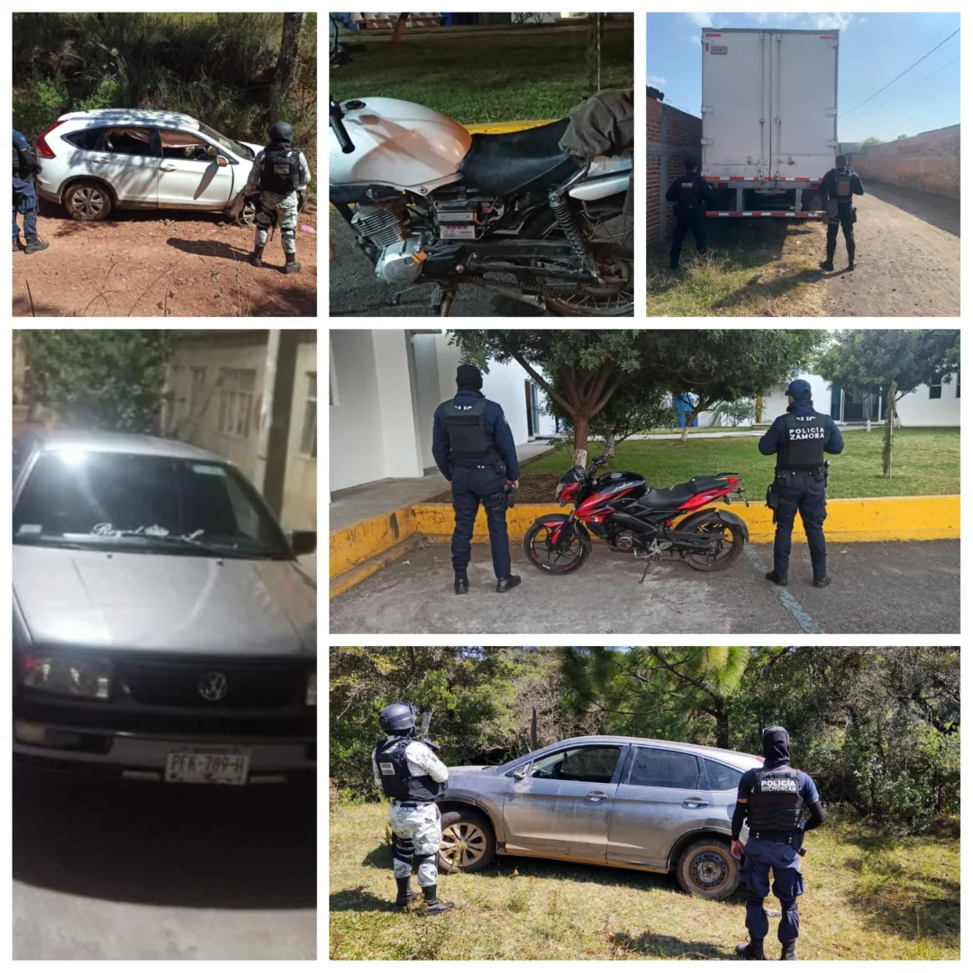 Como resultado de los operativos, los agentes de la Policía Michoacán recuperaron los siguientes automotores: una motocicleta Bajaj, una Yamaha, dos camionetas Honda, un vehículo de la marca Volkswagen y una caja seca de tactocamión.