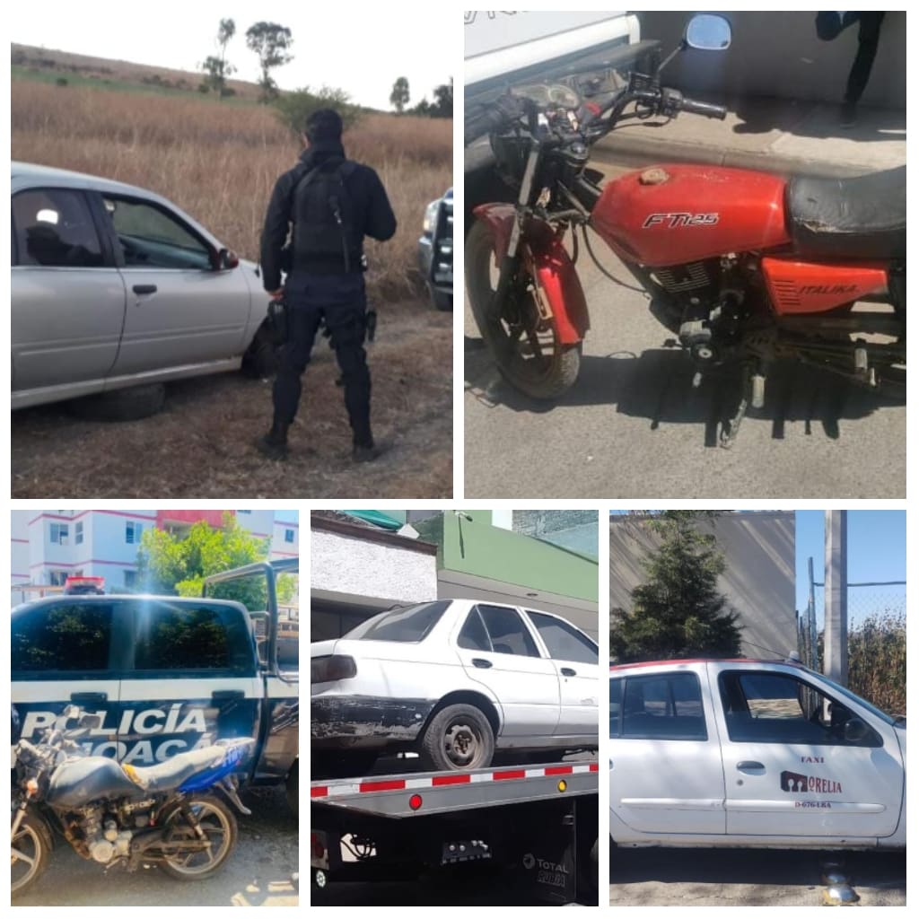 Las acciones de patrullaje y disuasión del delito realizadas en los municipios de Lázaro Cárdenas, Morelia y Uruapan, permitieron a la Policía Michoacán recuperar los siguientes vehículos: tres de la marca Nissan, una motocicleta Honda y una más Italika.
