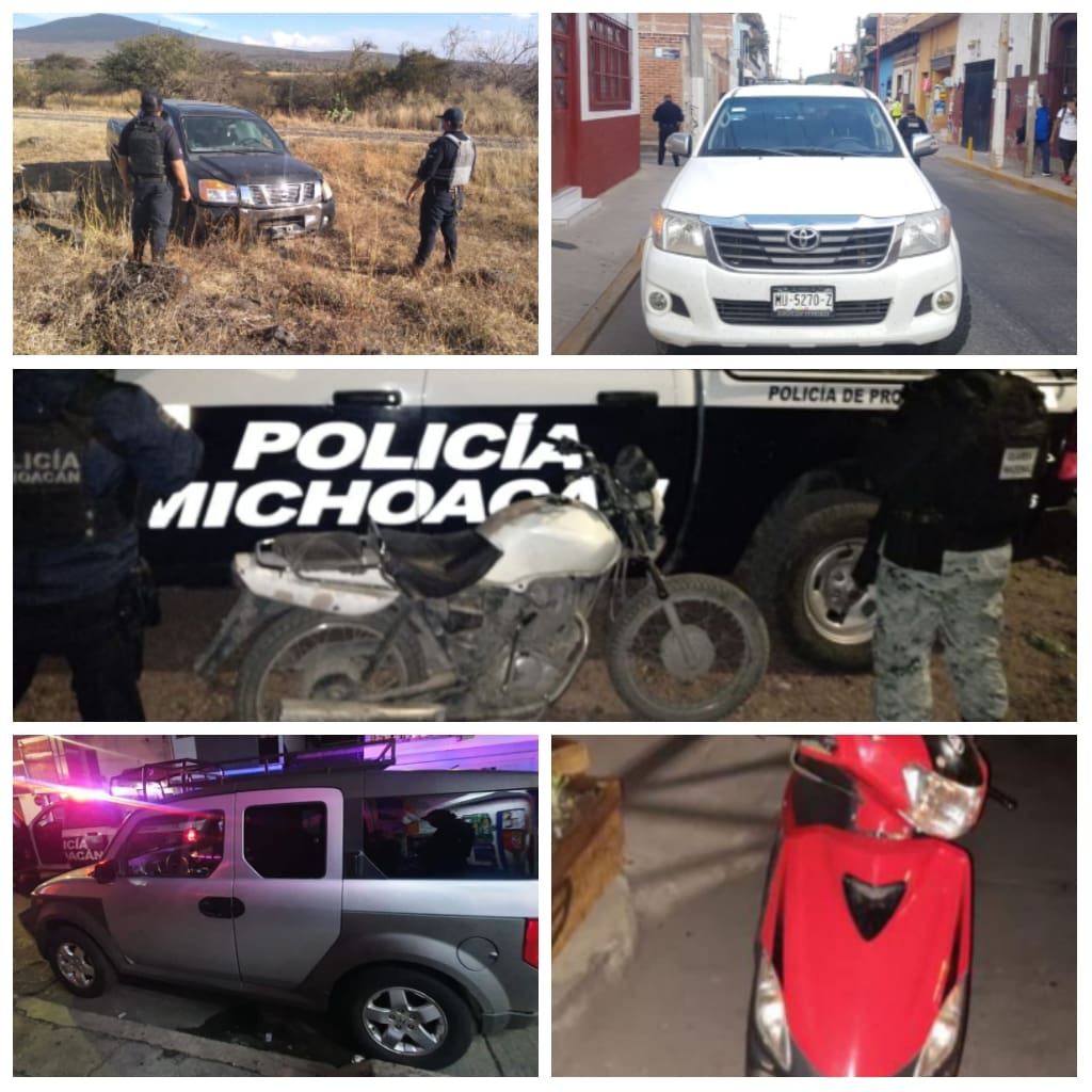 Las acciones de patrullaje y disuasión del delito realizadas en los municipios de Sahuayo, Morelia, Yurécuaro y Jacona, permitieron recuperar los siguientes vehículos: dos camionetas tipo pick up marca Nissan y Toyota, respectivamente, una camioneta Honda y dos motocicletas marcas Italika y Honda.