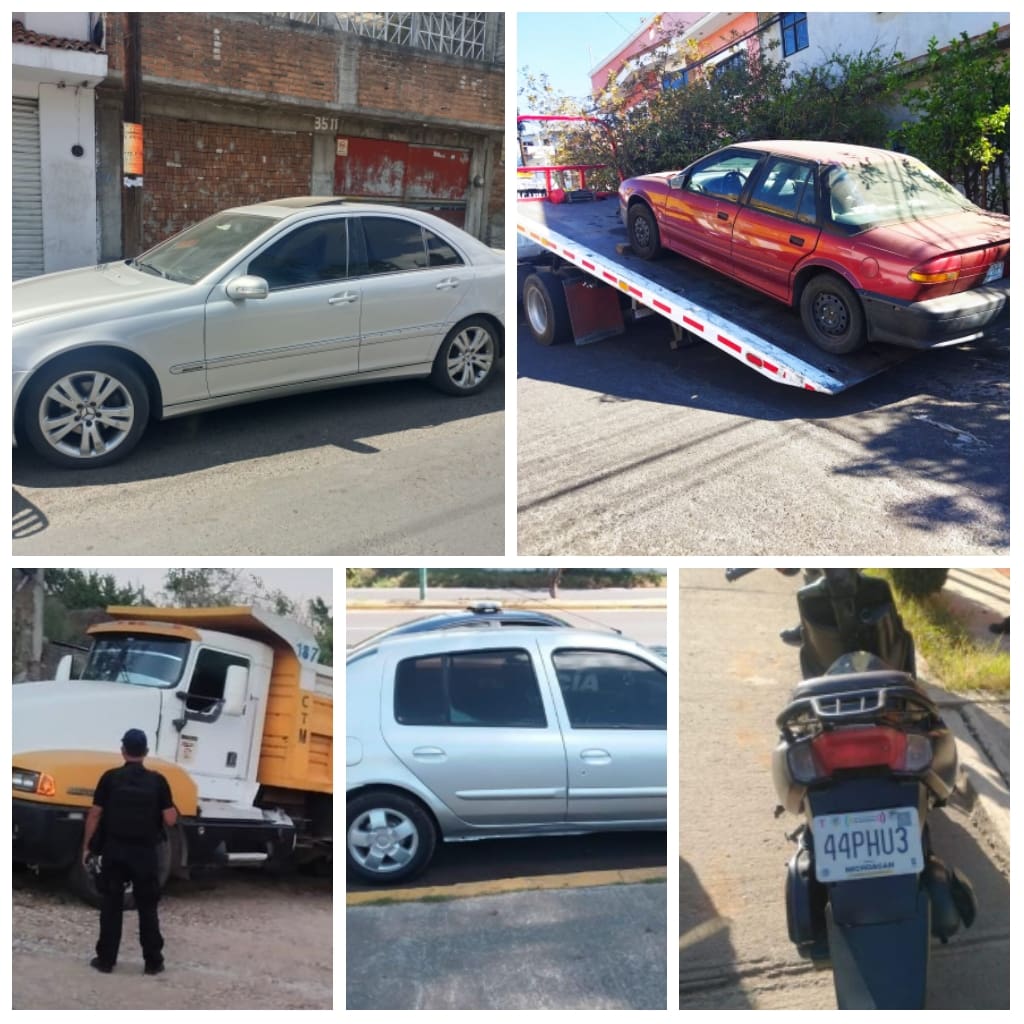 Las acciones de patrullaje y disuasión del delito realizadas en los municipios de Lázaro Cárdenas, Morelia, Pátzcuaro y Zamora, permitieron recuperar los siguientes vehículos: uno de la marca Chevrolet, una Italika, un KENWORTH, un Mercedes-Benz, un Nissan y una Yamaha.