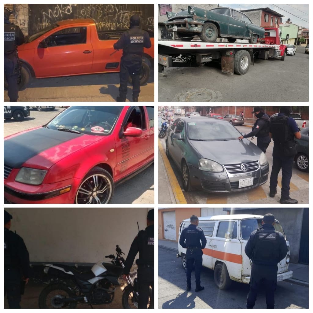 Las acciones de patrullaje y disuasión del delito realizadas en los municipios Briseñas, Jacona, Morelia y Tangancícuaro, permitieron a los uniformados recuperar los siguientes vehículos: uno de la marca Ford, cuatro Volkswagen y una motocicleta MB Motors.