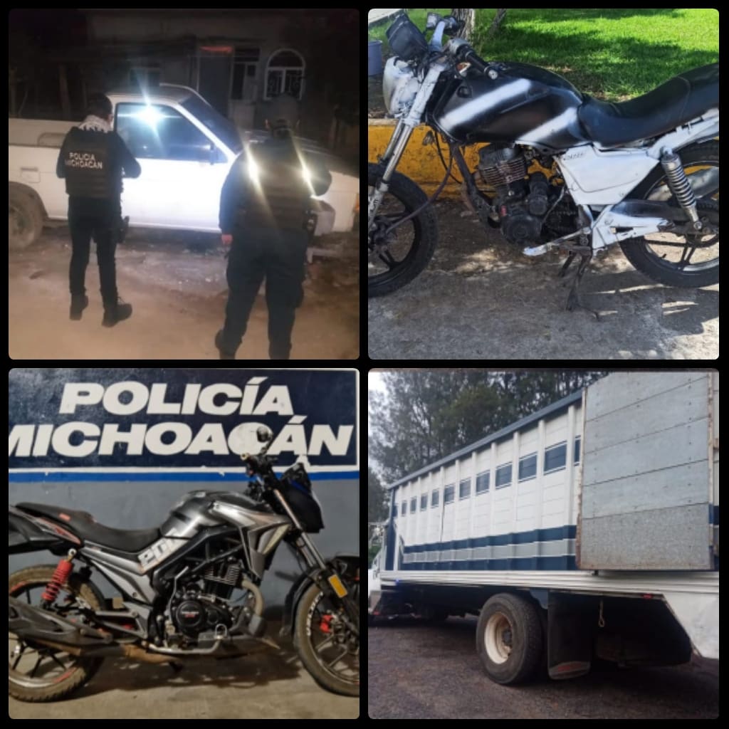 Las movilizaciones de seguridad se efectuaron en diversos puntos de los municipios de Tangamandapio, Uruapan y Zamora, donde los elementos policiales recuperaron los cuatro automotores de las siguientes marcas: Kanworth, Italika, Nissan y Veloci, respectivamente.