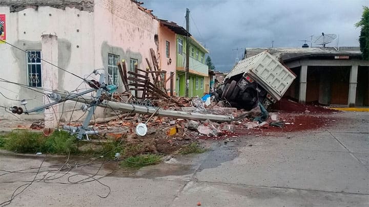 En Maravatío, un camión de volteo se lleva postes de luz en su paso, y ocasiona daños en dos viviendas