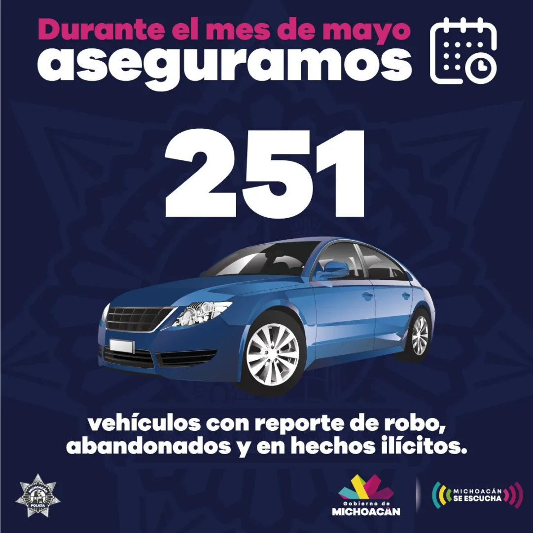 Morelia, Michoacán.- Durante el mes de mayo, elementos de la Secretaría de Seguridad Pública (SSP), llevaron a cabo el aseguramiento de 251 vehículos con reporte de robo e implicados en hechos ilícitos, respectivamente, en el territorio michoacano.