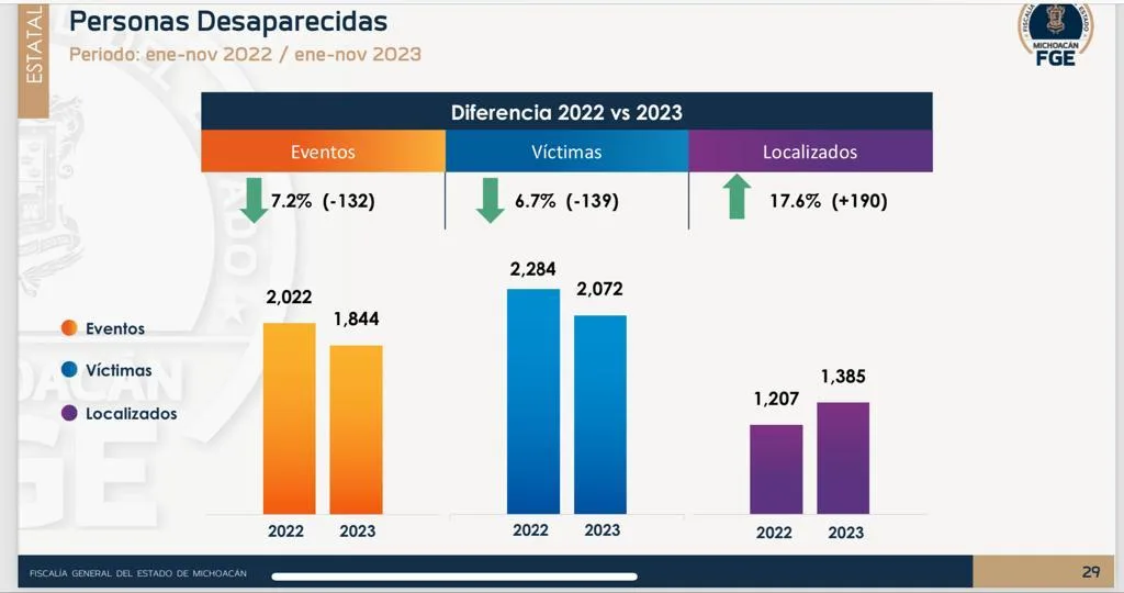 Morelia, Michoacán, 19 de diciembre de 2023.- Durante el periodo enero-noviembre de este año, disminuyó 6.7 por ciento el número de víctimas de desaparición forzada en Michoacán y aumentó 17.6 por ciento la localización de personas desaparecidas.