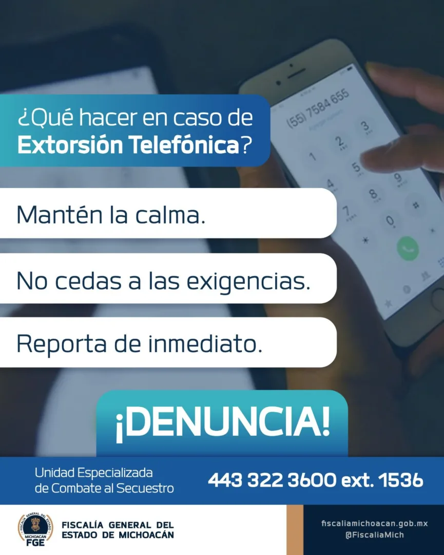 La FGE solicita a la población no atender este tipo de llamadas, y denunciarlas de forma inmediata ante la Fiscalía Regional más cercana, o bien a la Unidad Especializada de Combate al Secuestro, ubicada en Periférico Independencia #5000, colonia Sentimientos de la Nación en Morelia, o comunicarse al teléfono 443 322 36 00 extensión 2234.