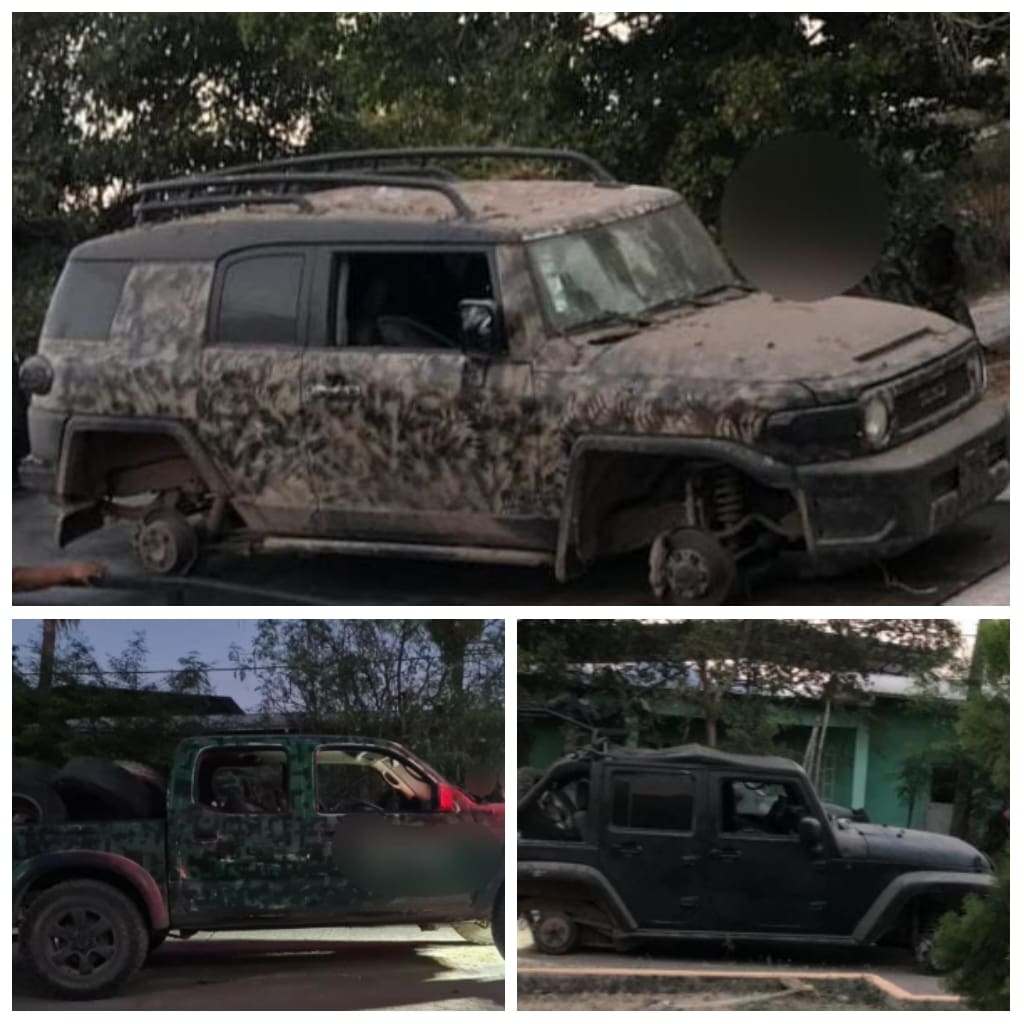 Fue durante la realización de recorridos de reconocimiento para la disuasión del delito en la localidad Naranjo de Chila, que los oficiales de las instituciones mencionadas, localizaron tres vehículos, dos de la marca Toyota y uno de la marca Jeep en aparente estado de abandono.
