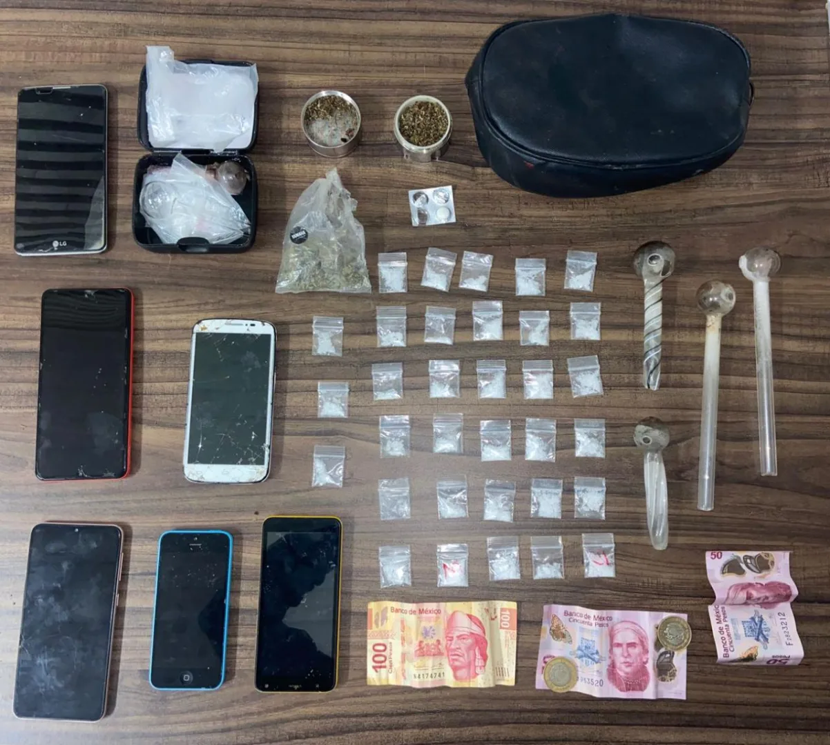Asimismo, luego de los trabajos efectuados, a los investigados les fueron encontrados indicios que los relacionan como posibles integrantes de una célula delictiva; también se encontraban en posesión de 33 envoltorios que contenían metanfetamina, dos más con marihuana, así como cuatro dispositivos de cristal utilizados para su consumo, seis celulares y dinero en efectivo, al parecer resultado de la venta de enervantes.