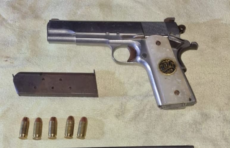 Posteriormente se le realizó una inspección, localizándoles entre sus pertenencias una pistola calibre .45mm con cinco cartuchos útiles y un cargador; por ello se procedió a detenerlo y junto con lo incautado, será trasladado ante la autoridad competente, a fin de llevar a cabo las diligencias correspondientes.