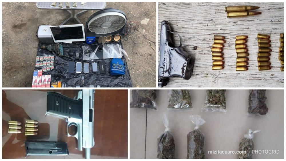 Juan C., José Jesús C., Vicente N., fueron detenidos por personal policial en Lázaro Cárdenas, en posesión de cinco envoltorios con marihuana, un con cristal, tres pipas para quemar cristal,14 cajetillas de cigarros, objetos de papelería, 10 celulares, un equipo de cómputo, un ventilador de piso, un taladro y seis bocinas.