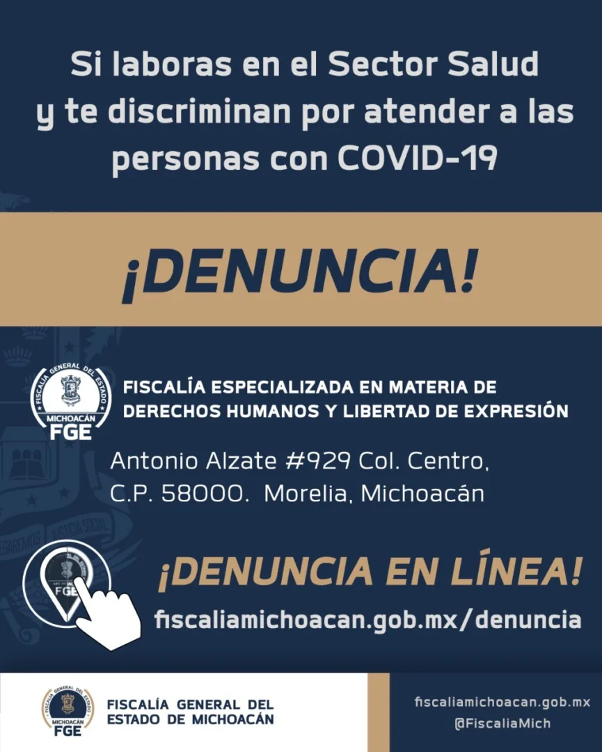 Morelia, Michoacán.- Ante la actual contingencia sanitaria COVID-19, y con el objetivo de evitar que las y los trabajadores del sector salud sean víctimas de actos discriminatorios, al prestar sus servicios, la Fiscalía General del Estado de Michoacán (FGE), a través de la Fiscalía Especializada en Materia de Derechos Humanos y Libertad de Expresión, exhorta a denunciar este tipo de conductas que atentan contra la dignidad humana.