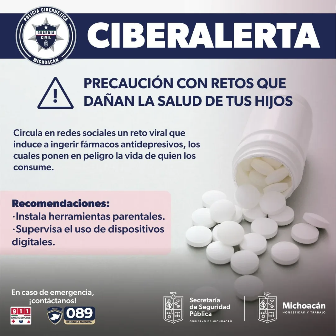 Para prevenir que la salud de los menores se vea expuesta, la SSP recomienda a padres de familia y adultos, revisar en todo momento las pertenencias de las y los menores, a fin evitar que cuenten con los fármacos en mención, asimismo, mantenerse al tanto de sus redes sociales para detectar alguna actitud inusual o que incite a realizar el reto.