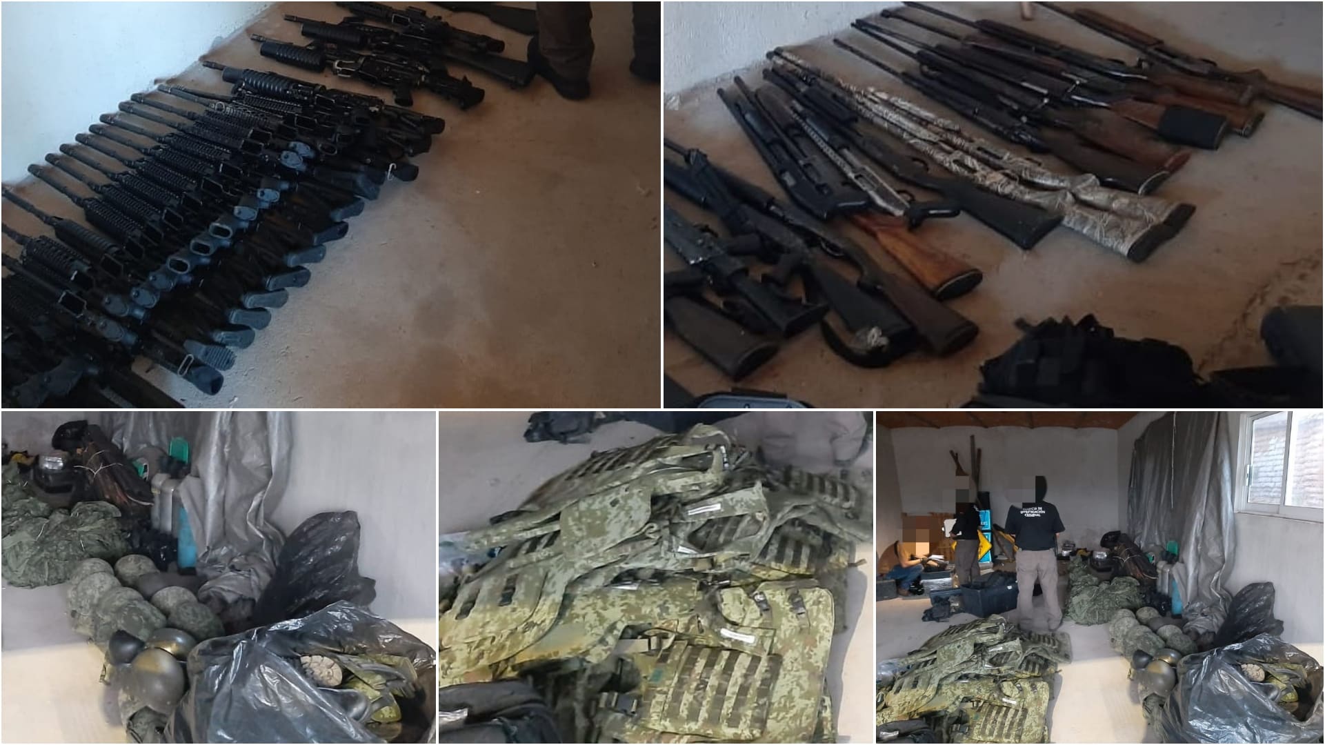 En el lugar se aseguró un arma larga tipo barret, 45 armas largas de diversos calibres, cuatro escopetas, mil 124 cartuchos útiles, 359 cargadores, 39 cascos balísticos, 24 chalecos balísticos, 48 placas balísticas, 148 porta cargadores, 12 fundas para arma de fuego, un vehículo, 47 camisas, 45 pantalones y 27 botas camuflajeadas; 27 fornituras, 11 cajas metálicas y cuatro tanques metálicos.