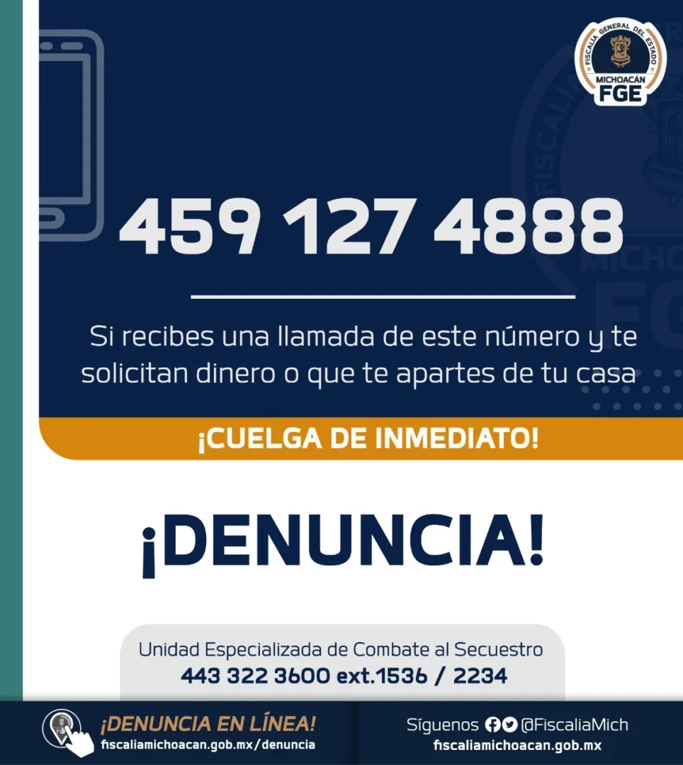 La FGE solicita a la población a no atender este tipo de llamadas y denunciarlas de forma inmediata ante la Fiscalía Regional más cercana, o bien, a la Unidad Especializada de Combate al Secuestro, ubicada en Periférico Independencia #5000, colonia Sentimientos de la Nación en Morelia, o comunicarse al teléfono 443 322 36 00 extensión 2234.