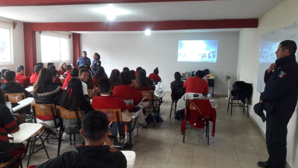ZITÁCUARO,Mich., 1 de diciembre de 2018.- Elementos de la Secretaría de Seguridad Pública Municipal, del área de Participación Ciudadana para la Prevención del Delito, fomentan valores sociales a 150 alumnos y padres de familia de la escuela primaria Álvaro Obregón y 64 alumnos del Colegio de Bachilleres del Estado de Michoacán.