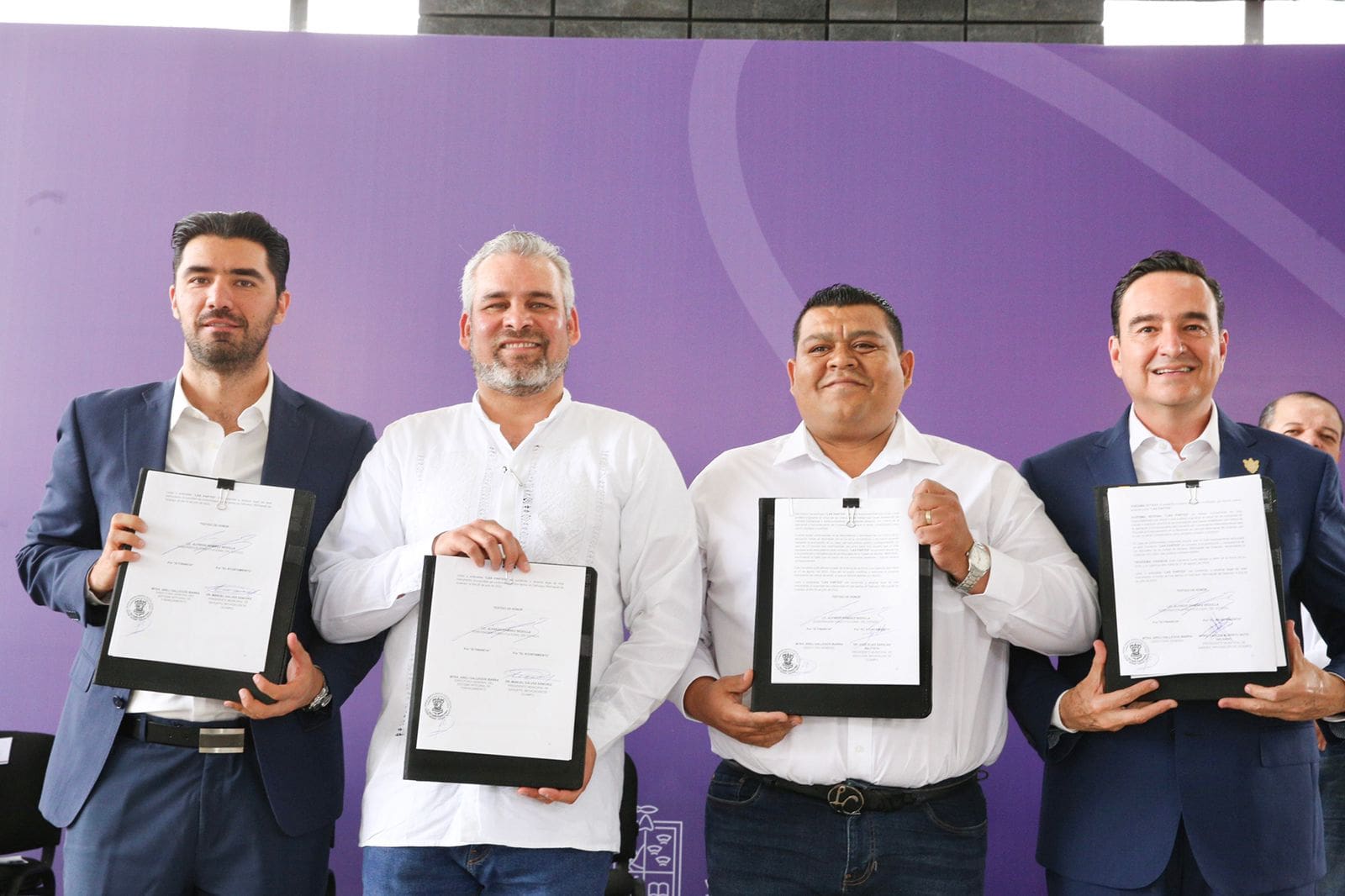 Sahuayo, Michoacán, 29 de julio del 2022.- El gobernador Alfredo Ramírez Bedolla encabezó la firma del convenio entre los presidentes municipales de Zamora, Sahuayo y Jiquilpan y autoridades estatales que promueven el programa Fuerza Mujer.
