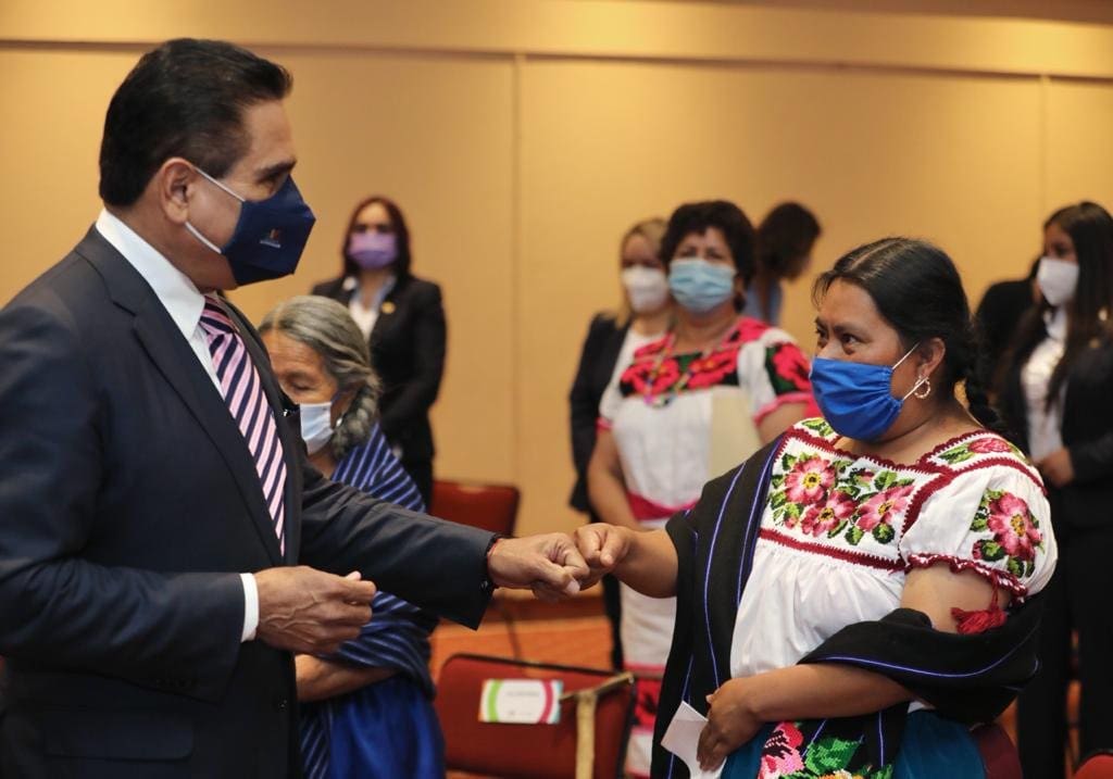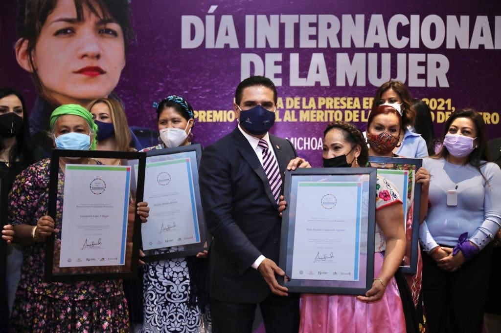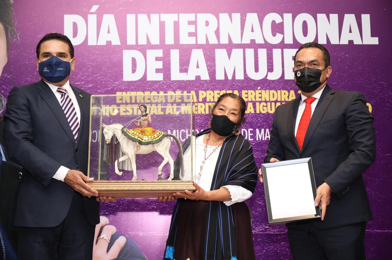 Aureoles Conejo entregó el Premio Estatal al Mérito de la Igualdad de Género, “Presea Eréndira 2021″, a María de la Luz Ponce Ávila, por el mérito al Impulso; a María Inés Dimas Carlos por el mérito a la Defensa de los Derechos Humanos y al Colectivo de Médicas Tradicionales “Menda Tiempo de Lluvias” por el mérito a la Perseverancia, a quienes les agradeció y reconoció su trabajo para construir un mejor Michoacán.