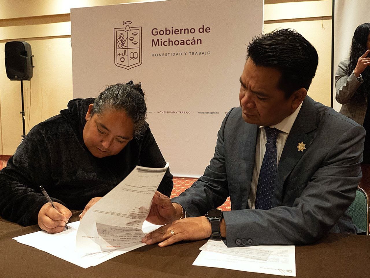 Morelia, Michoacán, 19 de enero del 2023.- En seguimiento a los compromisos de la administración estatal, encabezada por el Gobernador Alfredo Ramírez Bedolla, de dirigir los ahorros generados en la ejecución del Fondo para el Fortalecimiento para la Paz (Fortapaz), a seguros de vida para policías municipales, esta mañana se entregó el primer apoyo económico a la viuda de un elemento fallecido, perteneciente al municipio de Tacámbaro.
