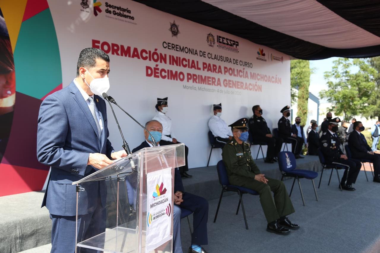 Morelia, Michoacán.- En representación del Gobernador del Estado Silvano Aureoles Conejo, el secretario de Seguridad Pública, Israel Patrón Reyes, encabezó la graduación de la Décimo Primera Generación de la Policía Michoacán, integrada por 66 agentes quienes reforzarán los esquemas operativos que se implementan en la entidad.